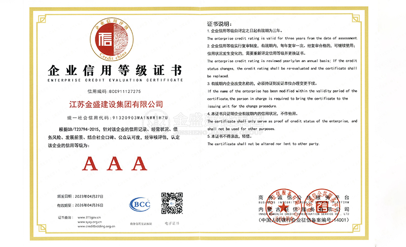 • 3A級資信等級證書